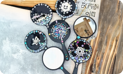 운영방식 손거울에 자개 스티커 붙인 후 레진으로 경화하는 방식
